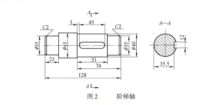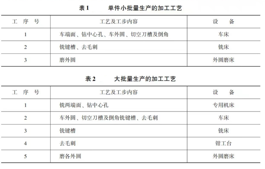 加工图2所示的阶梯轴,属于单件小批量生产时,可采用表1方案进行加工;属于大批量生产时,应采用表2方案进行加工。