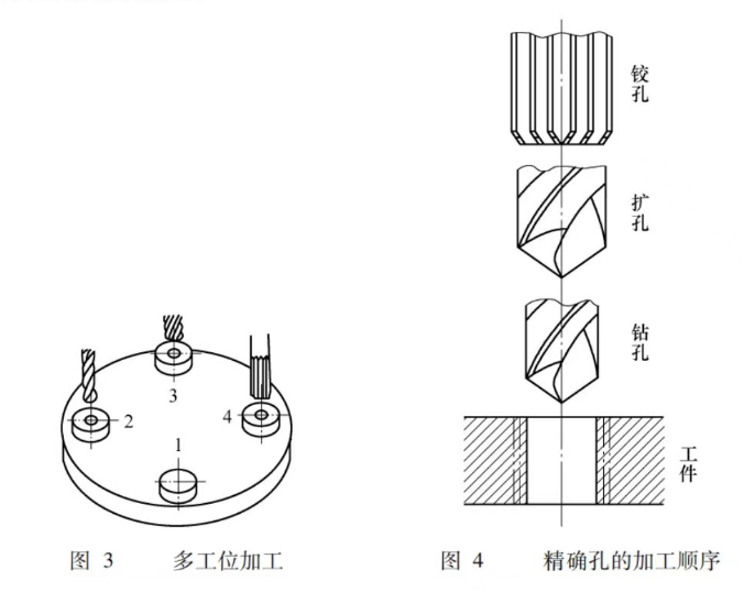 3) 工位。工位是为了完成一定的工序内容,一次装夹工件后,工件在机床或夹具中占有正确位置过程,即工位。工件每一次安装至少有一个工位。为了减少安装次数,常采用多工位夹具、回转工作台或在多轴机床上一次安装后进行多工位加工。多工位加工,可以减少工件安装次数,缩短辅助时间,提高生产效率。如图3所示为利用回转在工作台一次安装中顺序完成装卸工件、钻孔、扩孔和铰孔多个工位加工的实例。